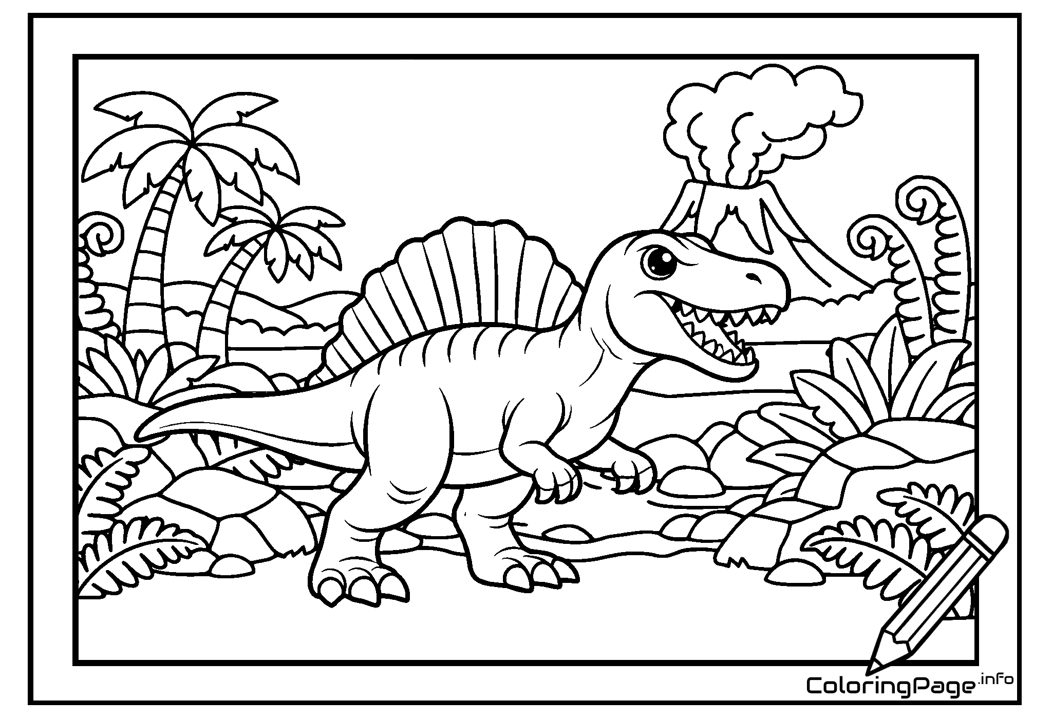Raptors in the Jungle coloring page shows five dynamic raptors around a basket of eggs in a lush jungle setting. An exciting printable coloring page for dinosaur fans. Also available online.